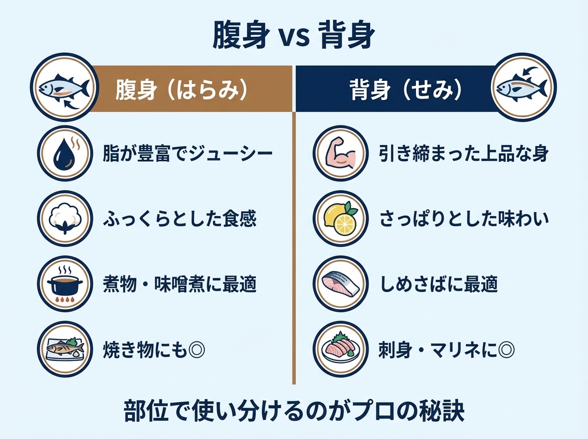 腹身の脂っけが苦手な方や、さかなのさっぱりとした旨味を楽しみたい方は背身がおすすめです。煮魚にも向いており煮崩れしにくく、形よく仕上がります。